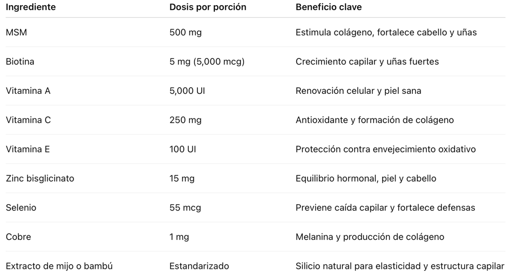 Público ideal: Mujeres y hombres adultos con debilidad capilar, piel opaca o uñas frágiles