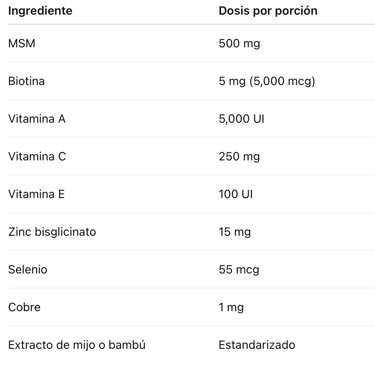 Es un suplemento de alta calidad formulado para fortalecer tu piel, cabello y uñas desde adentro. Combina vitaminas, minerales y extractos clínicamente respaldados para mejorar la salud y apariencia del cabello, la piel y las uñas.